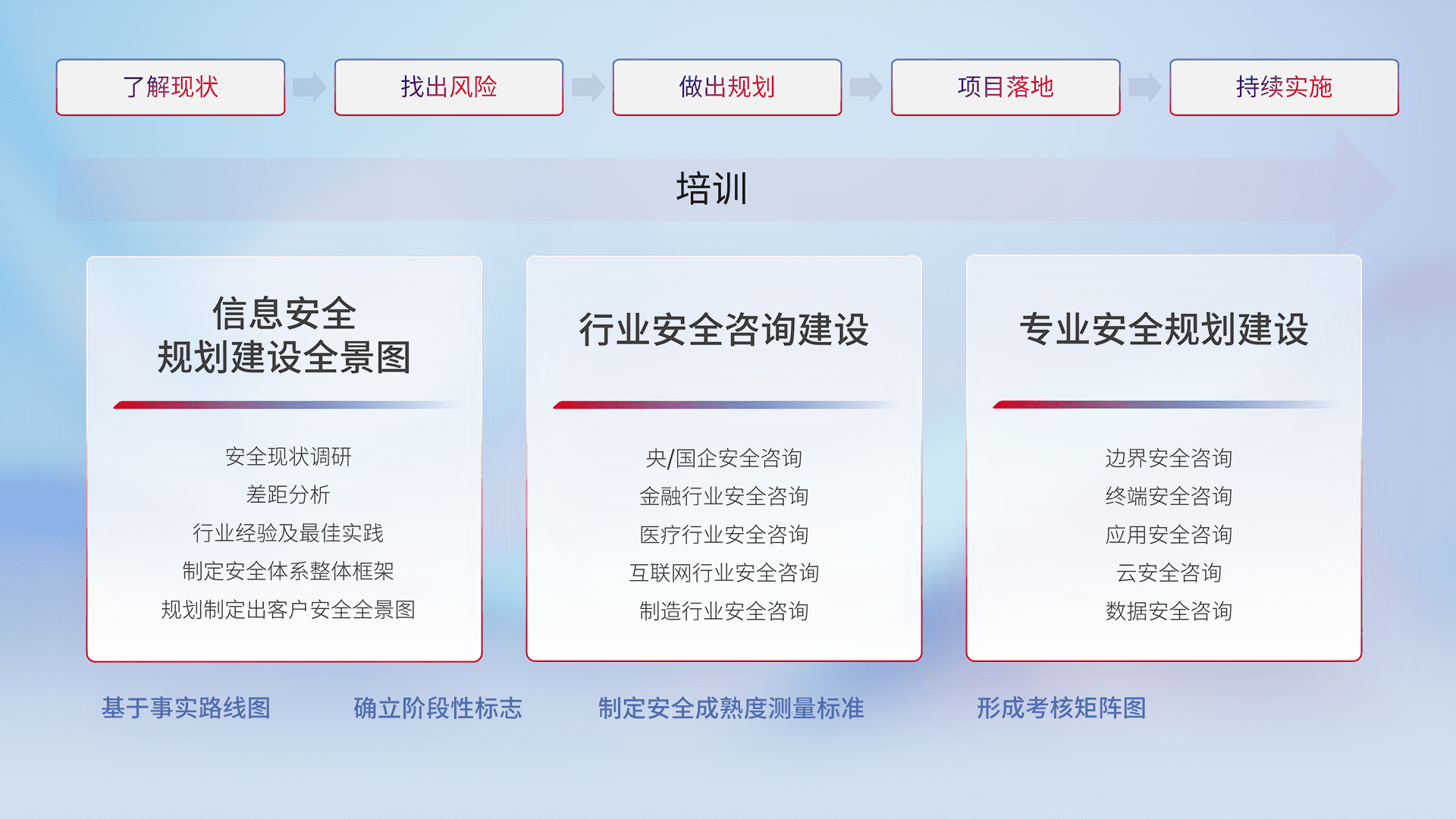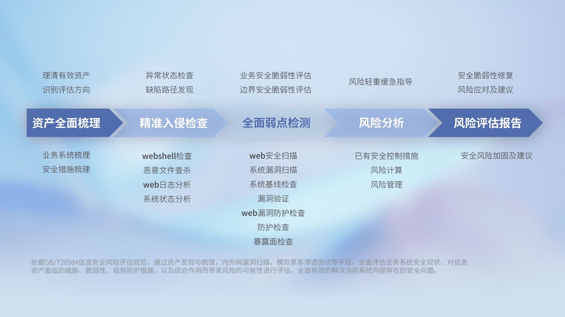 针对客户行业特性,,,,以专业的安全服务+多厂商联合解决方案提供专属的一站式安全管理服务,,,帮助客户全面感知网络空间威胁,,基于识别、、、检测、、、分析、、、、防护、、、监测、、、响应的服务理论模型,,从方案咨询、、、、集成交付、、、评估验证、、、、优化加固、、、运维运营,,,,致力于为客户提供完整的闭环管理式安全服务。。以实战经验为客户打造高抵御风险的安全体系,,,帮助客户发现威胁、、、对抗威胁、、、、处置威胁,,不断积累安全对抗能力,,,持续保障数字化安全。。。