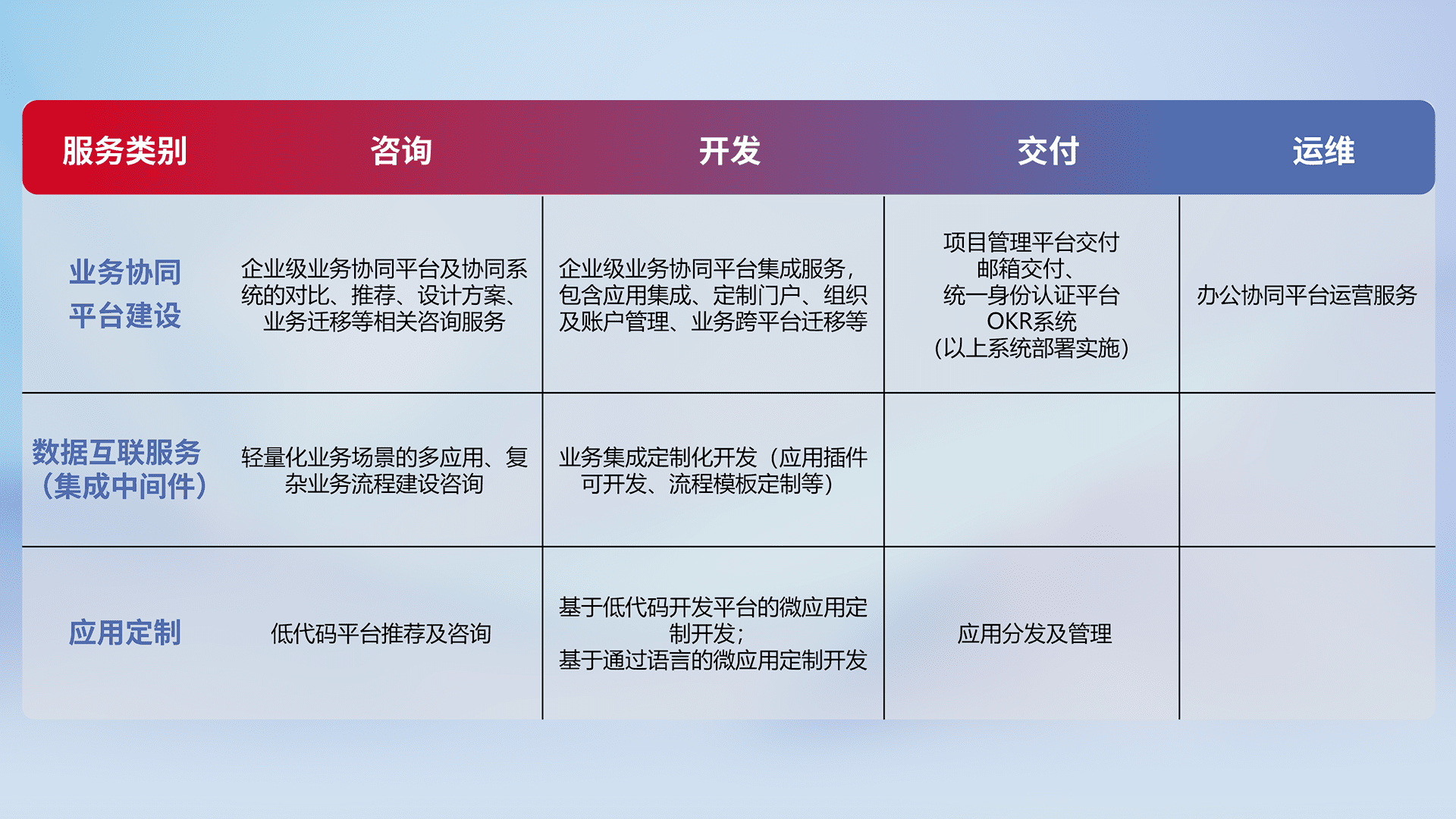 针对钉钉、、、企微、、、IDaas等平台级产品提供产品的规划、、方案、、、、交付、、定制化开发等服务,,实现如统一协同办公、、、、智能客户服务、、、、混合会议管理、、、、智能数据查询、、、等业务场景,,,,实现数字化转型。。。